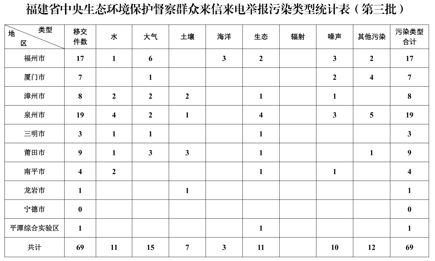 11月25日,中央第一生态环境保护督察组向福建省移交第三批群众信访举报件69件,其中来电举报51件,来信举报18件。从信访举报件生态环境问题类型来看,涉及水11件、大气15件、噪声10件、土壤7件、海洋3件、生态11件、其他污染12件。从区域分布上看,福州17件、厦门7件、漳州8件、泉州19件、三明3件、莆田9件、南平4件、龙岩1件、平潭1件。截至当日,福建省已累计收到中央第一生态环境保护督察组交办的信访举报件147件,所有举报件均已及时转交相关地市处理。