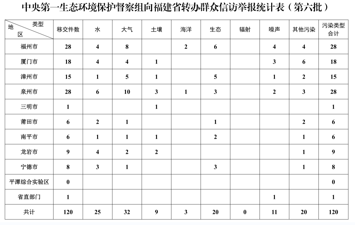 11月28日,中央第一生态环境保护督察组向福建省移交第六批群众信访举报件120件,其中来电举报61件,来信举报59件。从信访举报件生态环境问题类型来看,涉及水25件、大气32件、土壤9件、海洋3件、生态20件、噪声11件、其他污染20件。从区域分布上看,福州28件、厦门18件、漳州15件、泉州28件、三明1件、莆田6件、南平6件、龙岩9件、宁德8件、省直部门1件。截至当日,福建省已累计收到中央第一生态环境保护督察组交办的信访举报件473件,所有举报件均已及时转交相关地市和部门处理。