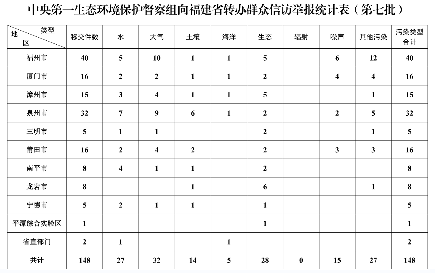 中央第一生态环境保护督察组向福建省转办第七批群众信访举报件148件