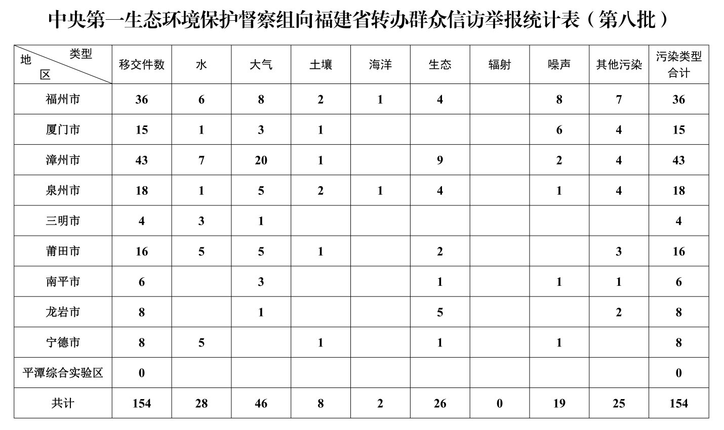 中央第一生态环境保护督察组向福建省转办第八批群众信访举报件154件