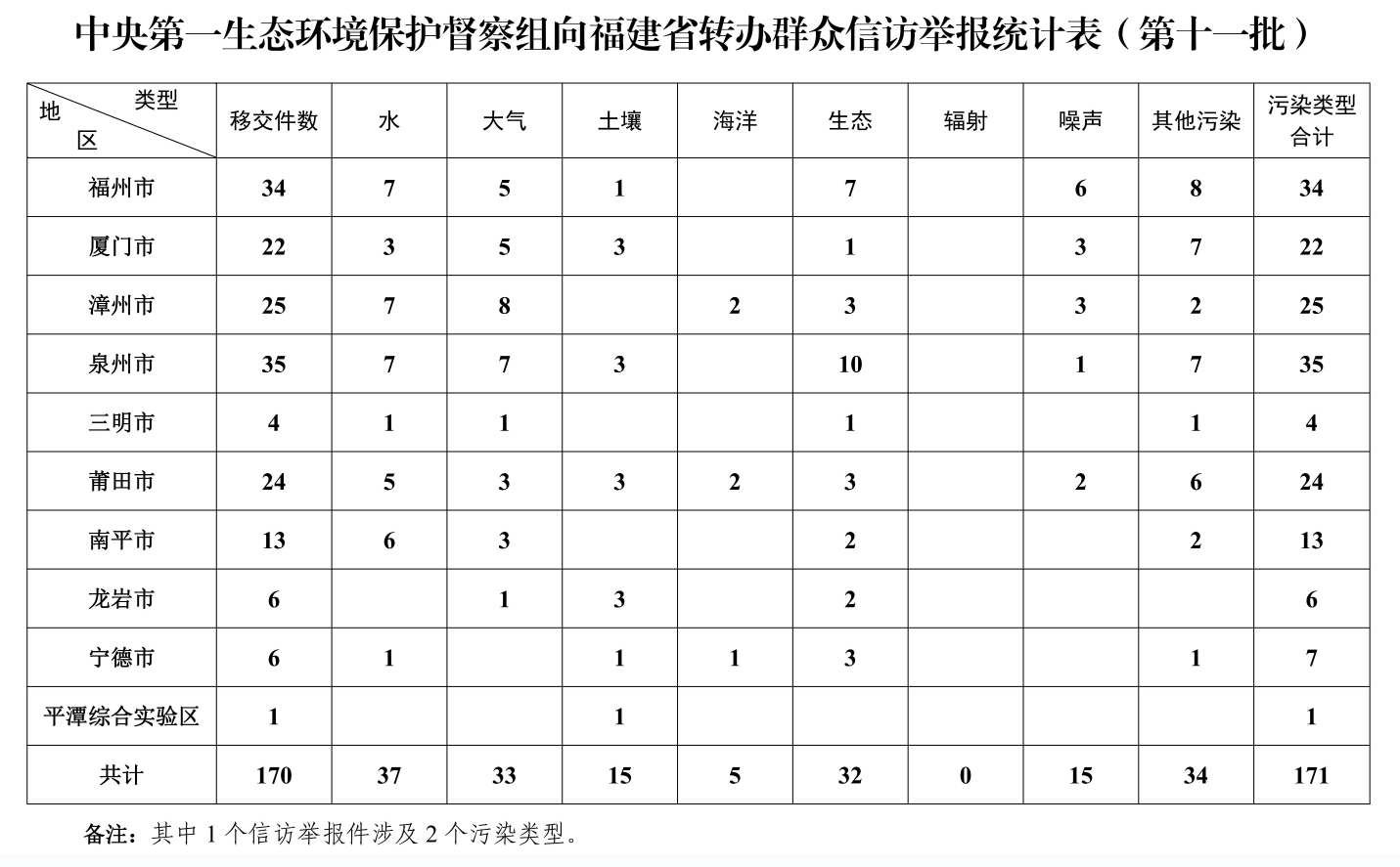 12月3日,中央第一生态环境保护督察组向福建省移交第十一批群众信访举报件170件,其中来电举报60件,来信举报110件。从信访举报件生态环境问题类型来看,涉及水37件、大气33件、土壤15件、海洋5件、生态32件、噪声15件、其他污染34件。从区域分布上看,福州34件、厦门22件、漳州25件、泉州35件、三明4件、莆田24件、南平13件、龙岩6件、宁德6件、平潭1件。截至当日,福建省已累计收到中央第一生态环境保护督察组交办的信访举报件1276件,所有举报件均已及时转交相关地市和部门处理。