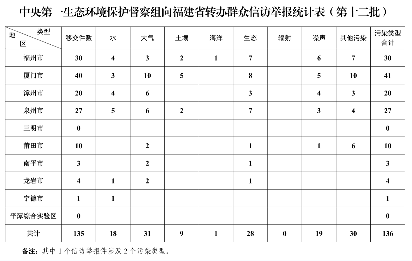 中央第一生态环境保护督察组向福建省转办第十二批群众信访举报件135件