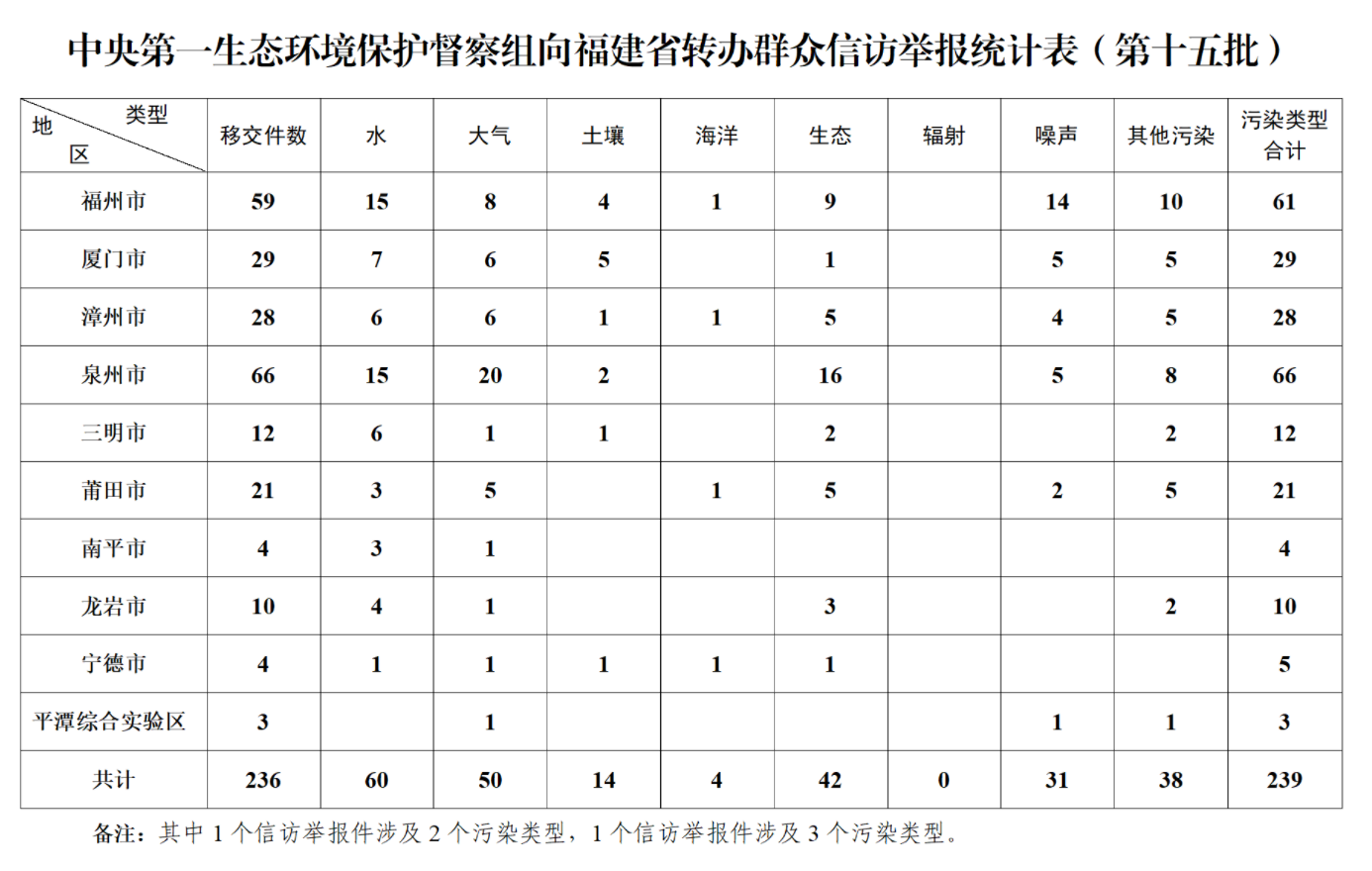 中央第一生态环境保护督察组向福建省转办第十五批群众信访举报件236件