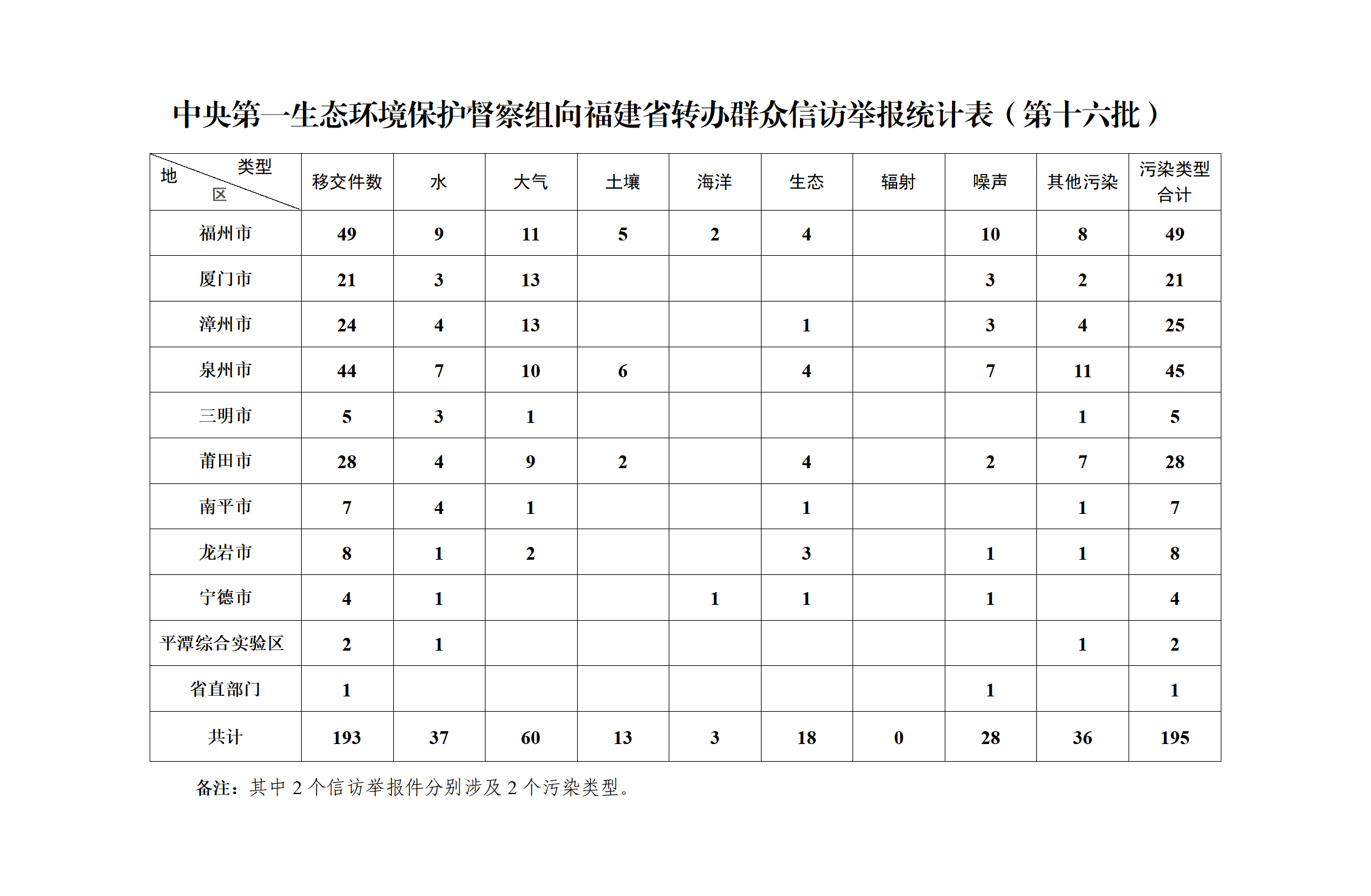 12月8日,中央第一生态环境保护督察组向福建省移交第十六批群众信访举报件193件,其中来电举报56件,来信举报137件。从信访举报件生态环境问题类型来看,涉及水37件、大气60件、土壤13件、海洋3件、生态18件、噪声28件、其他污染36件。从区域分布上看,福州49件、厦门21件、漳州24件、泉州44件、三明5件、莆田28件、南平7件、龙岩8件、宁德4件、平潭2件、省直部门1件。截至当日,福建省已累计收到中央第一生态环境保护督察组交办的信访举报件2119件,所有举报件均已及时转交相关地市和部门处理。