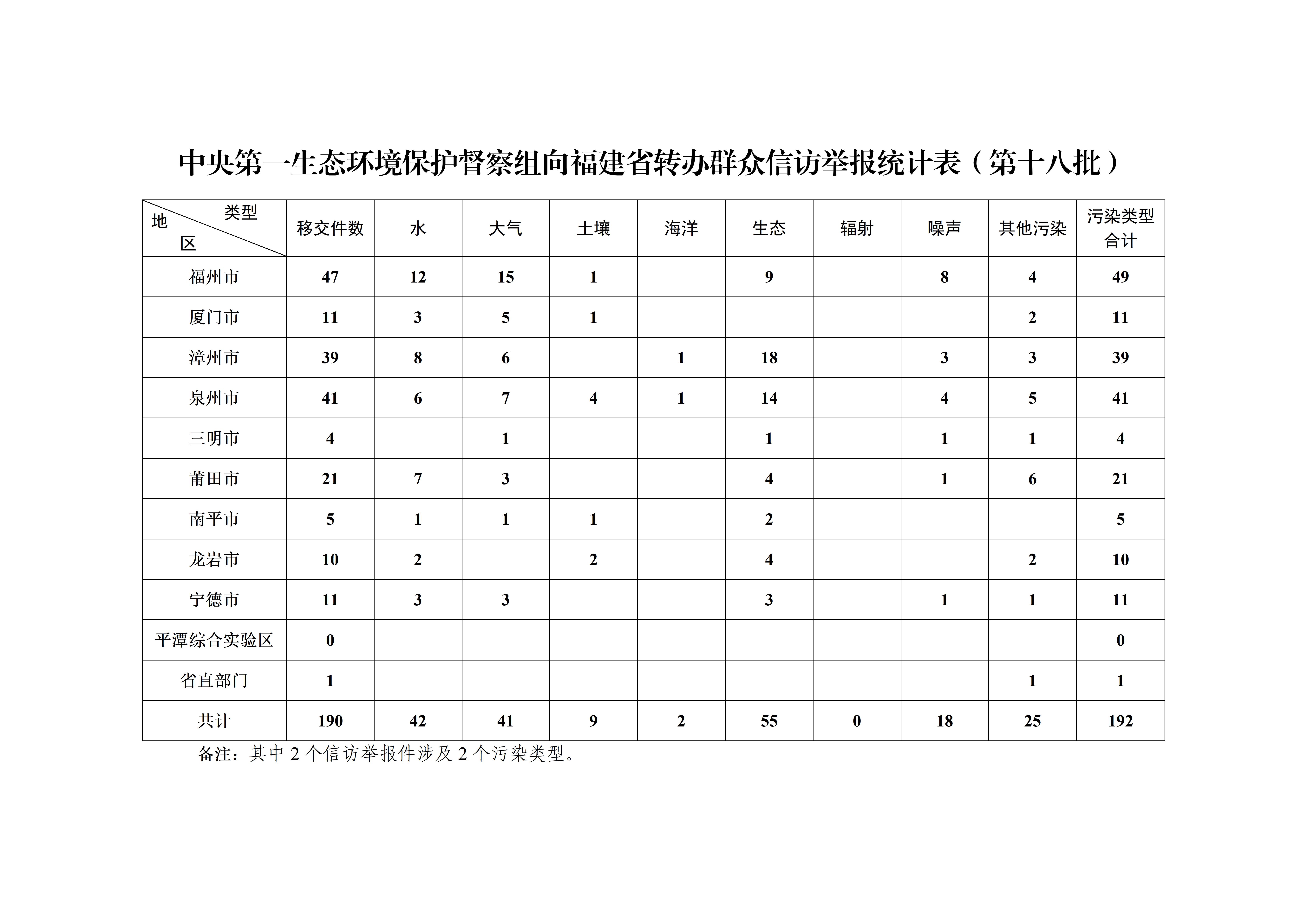 中央第一生态环境保护督察组向福建省转办第十八批群众信访举报件190件