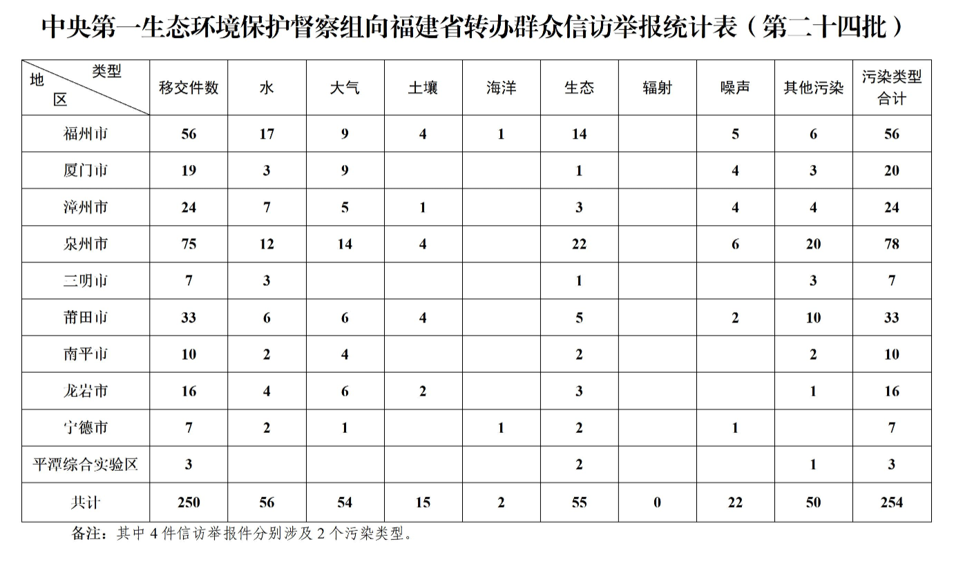 12月16日,中央第一生态环境保护督察组向福建省移交第二十四批群众信访举报件250件,其中来电举报64件,来信举报186件。从信访举报件生态环境问题类型来看,涉及水56件、大气54件、土壤15件、海洋2件、生态55件、噪声22件、其他污染50件。从区域分布上看,福州56件、厦门19件、漳州24件、泉州75件、三明7件、莆田33件、南平10件、龙岩16件、宁德7件、平潭3件。截至当日,福建省已累计收到中央第一生态环境保护督察组交办的信访举报件3801件(重复件1504件),所有举报件均已及时转交相关地市和部门处理。