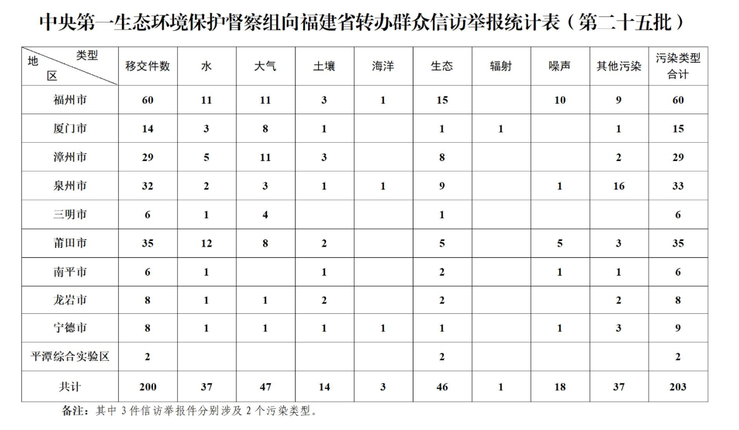 12月17日,中央第一生态环境保护督察组向福建省移交第二十五批群众信访举报件200件,其中来电举报46件,来信举报154件。从信访举报件生态环境问题类型来看,涉及水37件、大气47件、土壤14件、海洋3件、生态46件、辐射1件、噪声18件、其他污染37件。从区域分布上看,福州60件、厦门14件、漳州29件、泉州32件、三明6件、莆田35件、南平6件、龙岩8件、宁德8件、平潭2件。截至当日,福建省已累计收到中央第一生态环境保护督察组交办的信访举报件4001件(重复件1646件),所有举报件均已及时转交相关地市和部门处理。