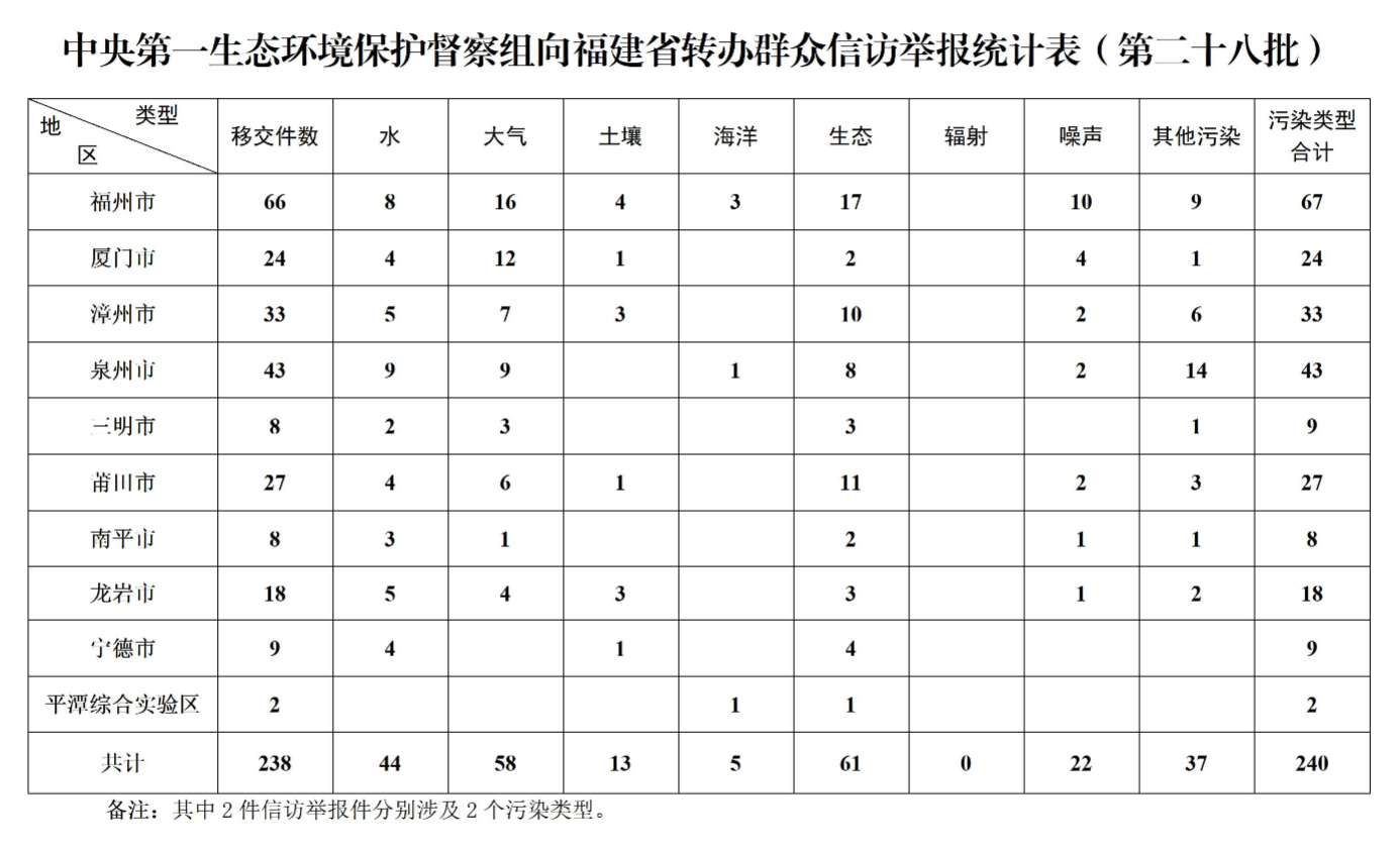 中央第一生态环境保护督察组向福建省转办第二十八批群众信访举报件238件