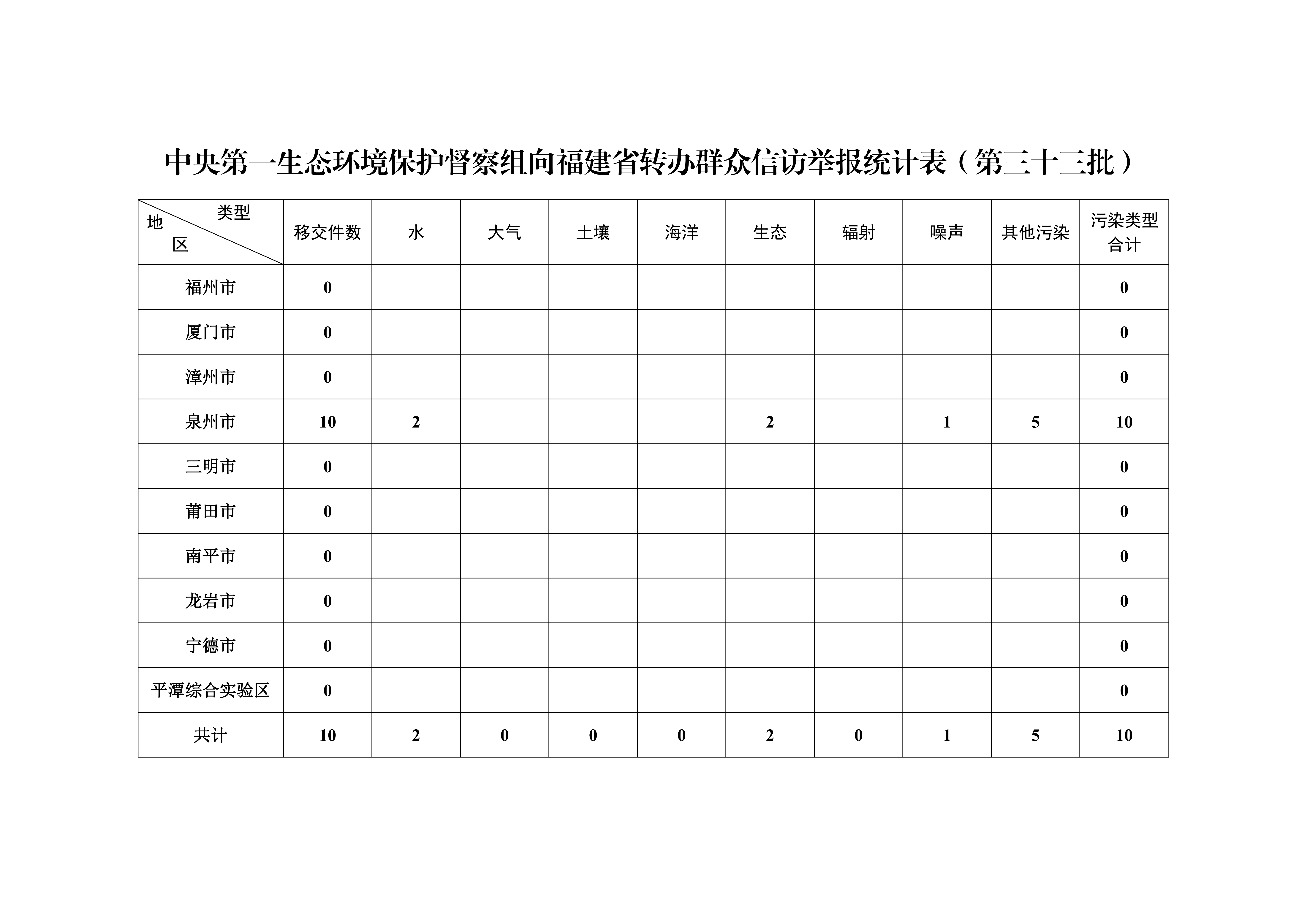 12月29日,中央第一生态环境保护督察组向福建省移交第三十三批群众信访举报件10件,其中来信举报10件。从信访举报件生态环境问题类型来看,涉及水2件、生态2件、噪声1件、其他污染5件。从区域分布上看,泉州10件。截至当日,福建省已累计收到中央第一生态环境保护督察组交办的信访举报件5575件(重复件2551件),所有举报件均已及时转交相关地市和部门处理。