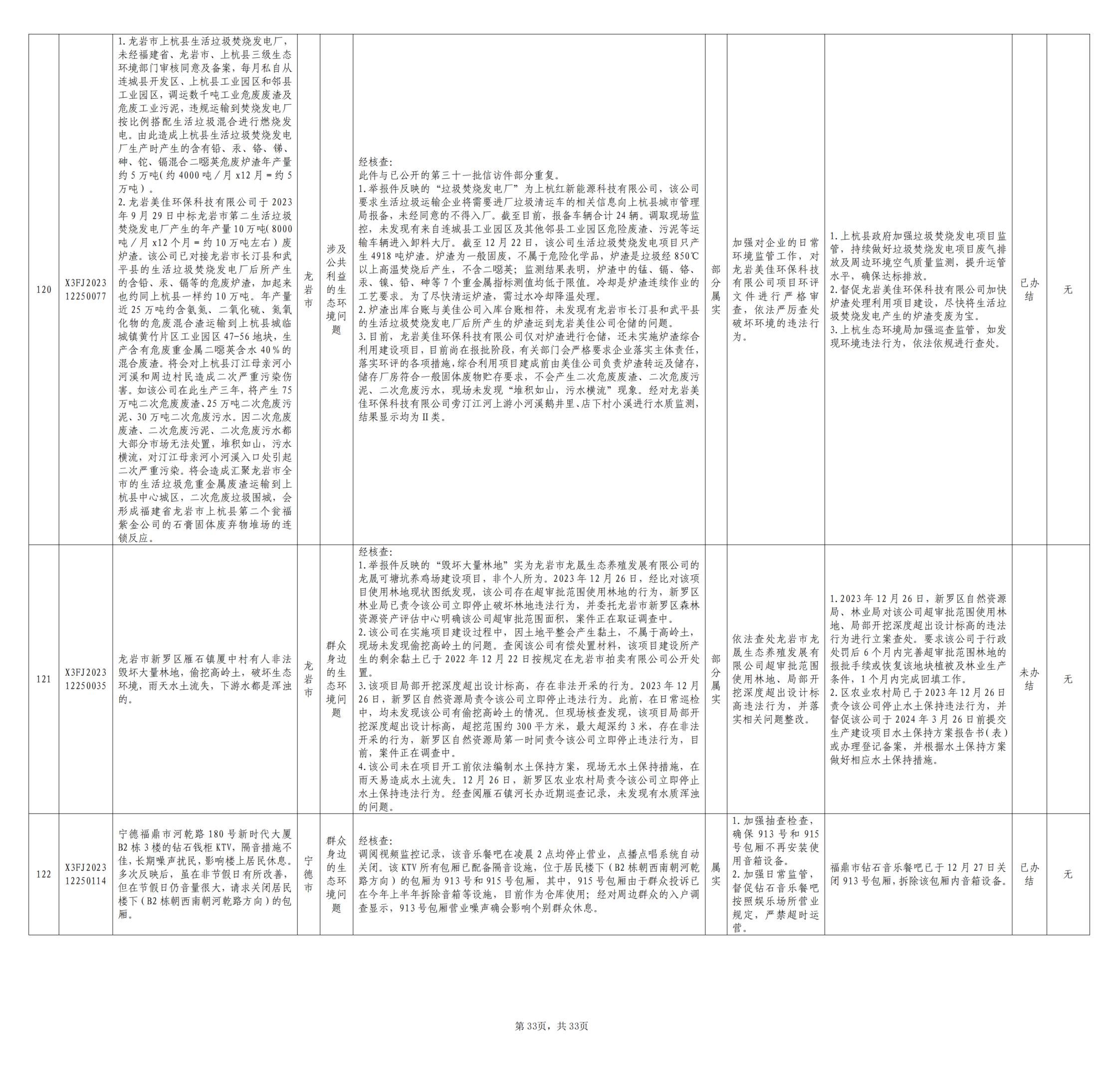 截至2024年1月4日,对中央第一生态环境保护督察组向我省移交的第三十二批群众信访举报件122件,各责任单位均按要求上报调查处理情况。根据督察要求,群众信访举报转办和边督边改公开情况一览表将在报纸、网站等媒体上公布。